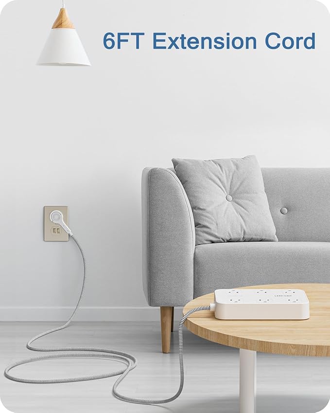 - 6 Ft Extension Cord & Ultra Thin Flat Plug: 6ft power cord allows you to keep the power strip in an unobtrusive location while making sure it reaches your devices. With only 0.36 inch flat polarized plug, this power strip surge protector can infinitely close to the wall, hide in the back of furniture, bed or refrigerator, maximum save your space. The folding ring helps you unplug the plug easily in the narrow space. The 45° right angle low profile flat plug design keeps anther outlet free.