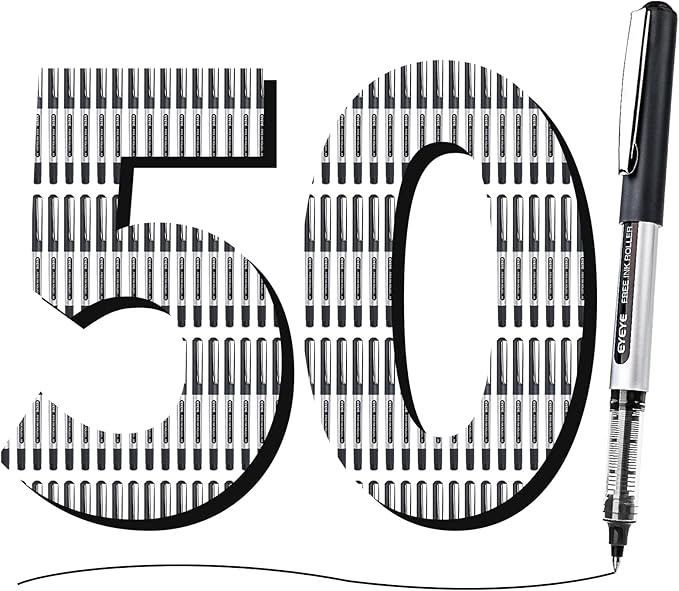 EYEYE Rollerball Pens 0.5mm Black 50 Pack, Extra Fine Point Quick Dry Liquid Ink Roller Ball Pens Fine Point Smooth Writing Pen for Journaling, Note Taking, Office, School Supplies