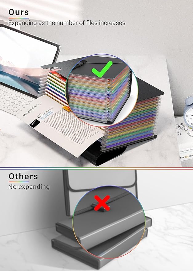 - ✔【STURDY MATERIALS】Accordian file folder are made by high quality polypropylene and polyester,20% and more thicker than other file organizer, it can stand on the desktop independently when unfolding, no easy to be broken and deformed. 100% Waterproof, Non toxic, Non Odor, Anti-wear, tear and Moisture resistant.