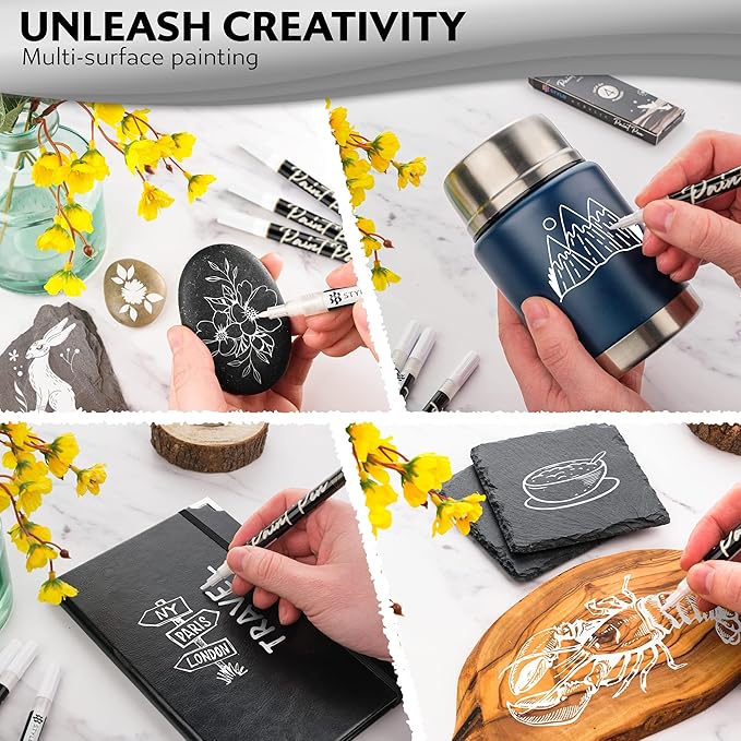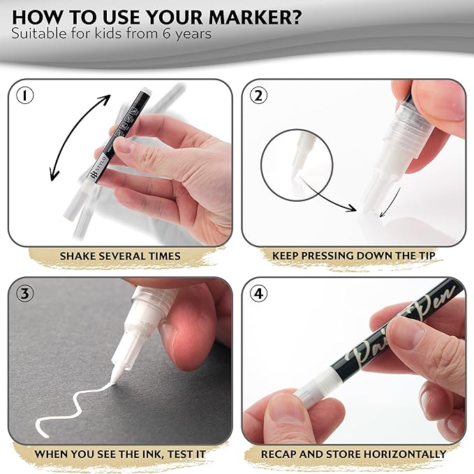 - VERSATILITY – 8 x White marker mettalic pen suitable to work on wood, fabric, glass, ceramic, stones and other surfaces