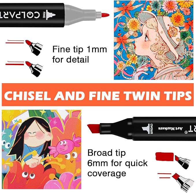 - 【Dual Tips Alcohol Markers】Dual Tips Art Markers Design allows you to make thick and thin lines without changing markers.Includes Fine tip 1mm and Broad tip 6mm twin tips for precise highlighting, sketching and underlining. Thin markers can be used to write and hook line while thick art markers professional are suitable for drawing and coloring.