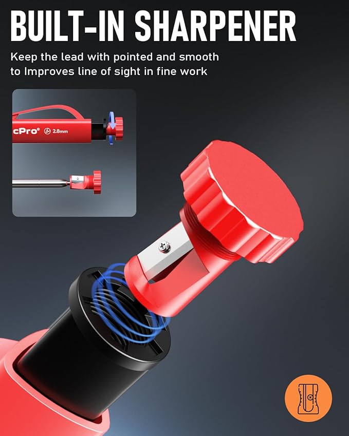 - Deep Hole Marker Pencil With Sharpener: The deep-hole construction pencils adopts 45mm elongated tip design, which is more convenient to mark in the small hole or in other tight areas. In addition this, the woodworking pencils come with a built in sharpener screwed into the top of each work pencil for providing nice precision at all times