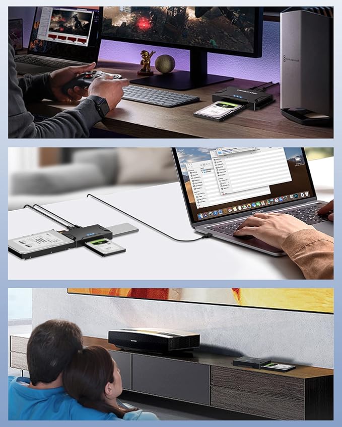 - Universal Compatibility:The adapter supports Windows 10/8/7/Vista, Linux, Mac OS 9.0 to 10.13.3, PS4, Xbox One.Widely compatible with all kinds of SSD & HDD, including Western Digital, Seagate, Toshiba, Samsung. It also works with DVD-ROM, CD-ROM, CD-RW, DVD-RW, DVD+RW, etc. Supports reading and writing to three drives at the same time.
