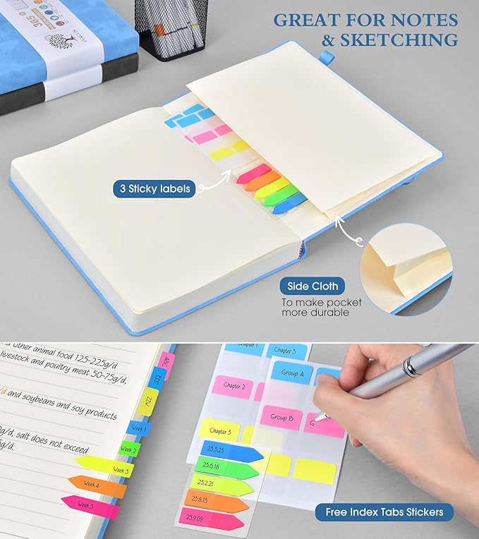 - 【180°Lay Flat for Writing】Our notebook also comes with 180°Lay Flat Journal Notebook, which makes writing a breeze. The elastic pen holder and bookmark ensure that you never lose track of your pen, and the 2 elastic closures ensure that your journal stays securely closed. The 3 colored ribbon bookmarks and 3 sticky labels provide even more ways to customize your journal to your liking.Built-in back pocket that is great for storing loose notes, cards, or other important items.