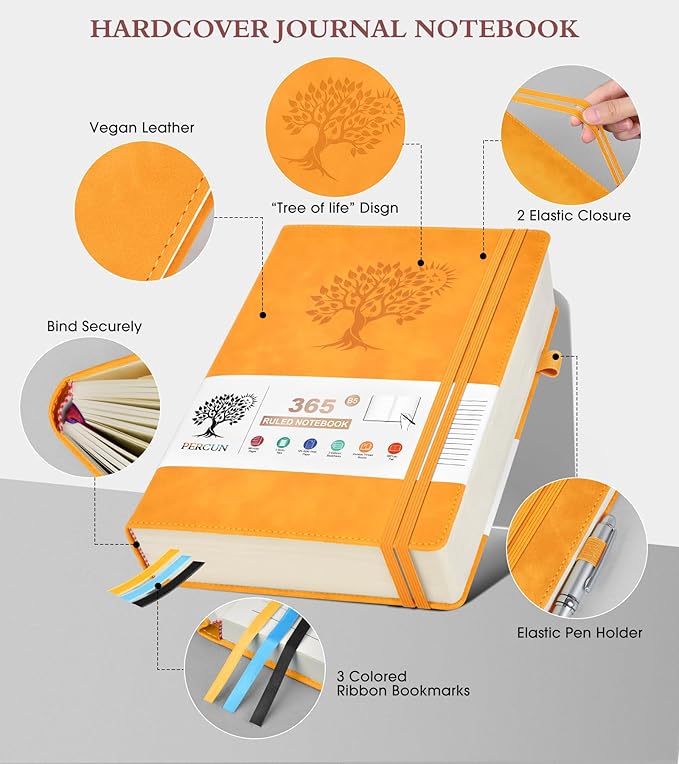 - 【365 Pages Premium Thick Paper】: Our PERCUN lined journal notebook is made of 365 pages high-quality 100Gsm thick ruled pager with an acid-free light Ivory paper that is thicker than normal. This premium quality paper will not cause bleeding, ghosting or smudging and is suitable for most types of pens,provides ample space for journaling, note-taking, and creative writing. The line spacing is 7mm, making it easy to write legibly and neatly.
