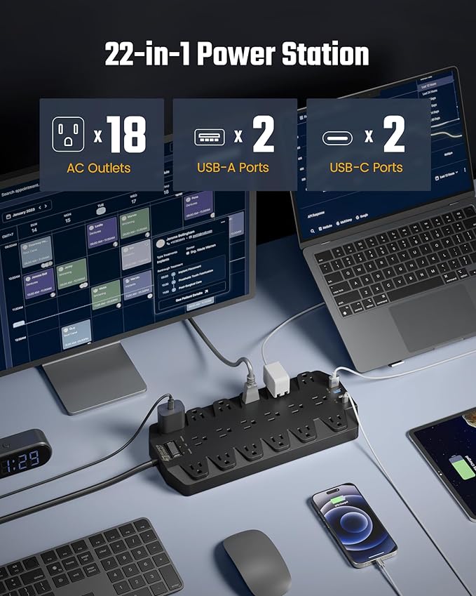 - 【22-in-1 Versatile Power Strip】 FCC, RoHS safety certified, with the extension cord and flat plug certified by UL. SUPERDANNY power strip surge protector has 18 grounded 3-prong outlets and 4 USB ports, providing power for all devices that you need to plug in at one location. Perfect for gaming or media set up, surround sound system, TV, phone, tablet, PC, laptop, gaming computers, lamps, and other devices simultaneously.