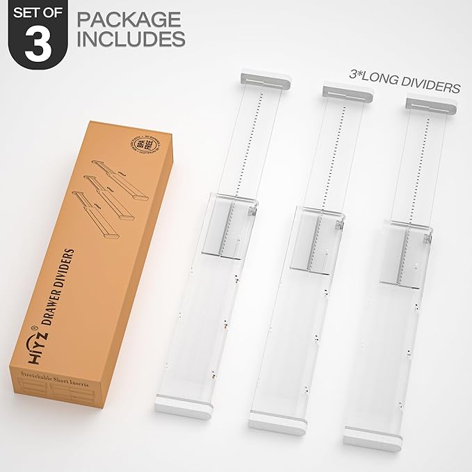- PATENTED EXPANDABLE DESIGN: HiYZ drawer divider adopts a design that can be stretched in length and width, you can adjust the length of long dividers and short inserts at will to more conveniently store items of any size in the drawer. Compared with other ordinary drawer organizers, we have more advantages in organizing