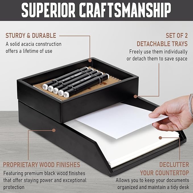 Demigo Desk Organizer Letter Tray Set of 2, Acacia Wood Tabletop Desktop for Storage Paper Letter Folders Notebooks Copy Print, Workspace Holder, Keep Stationery Saver (Black)