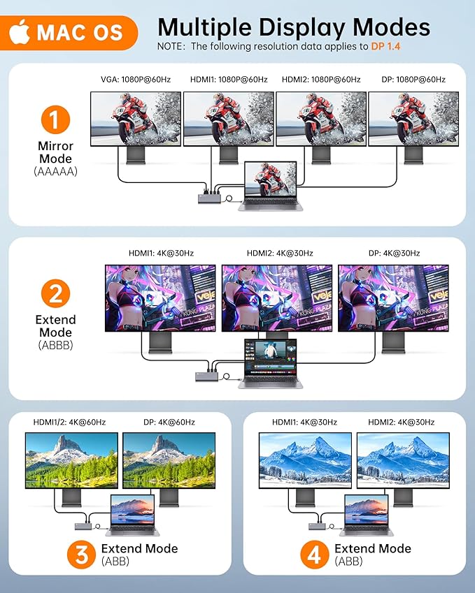 - 【4K@30Hz Triple Display Docking Station 3 Monitors】NOVOO USB C Docking Station will hook up triple displays to dual HDMI and DP in 4K@30Hz (DP1.4 Source).★★Windows System support MST and SST(Mirror & Extend Mode). All MacBook laptop only supports SST mode, MAC OS can only extend one monitor. Single DisplayPort support up to 8K@30Hz. With this USB C Dock, you can enjoy an 8K ultra high definition movie experience and 3D visual effects