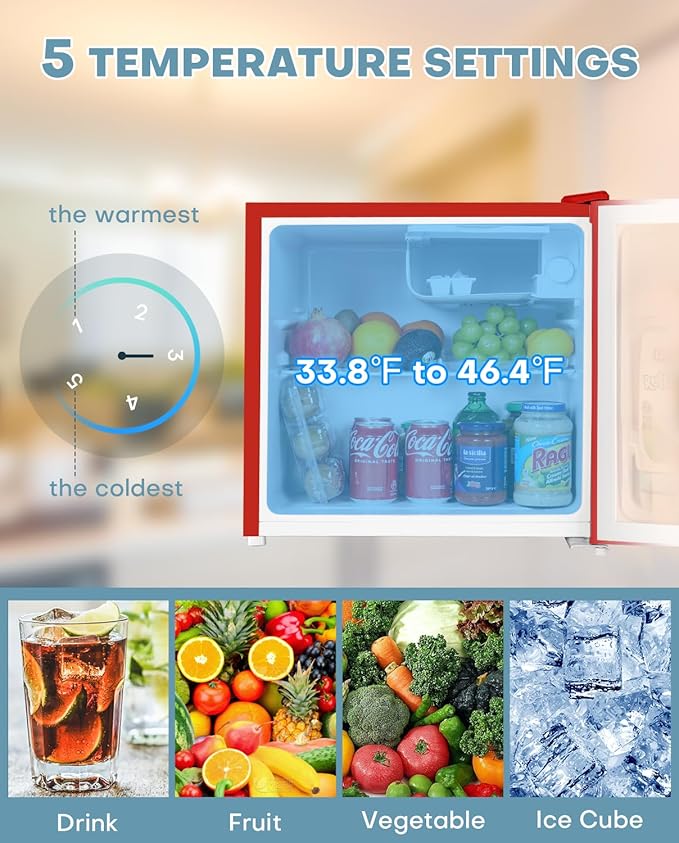 - Adjustable Temperatures: Ranges from 33.8° F to 46.4° F (Not for storing ice cream), the fridge offers 5 variable temperature settings per your need. Includes a compact freezer that allow you to make ice cubes, keep your food fresh and drinks chilled