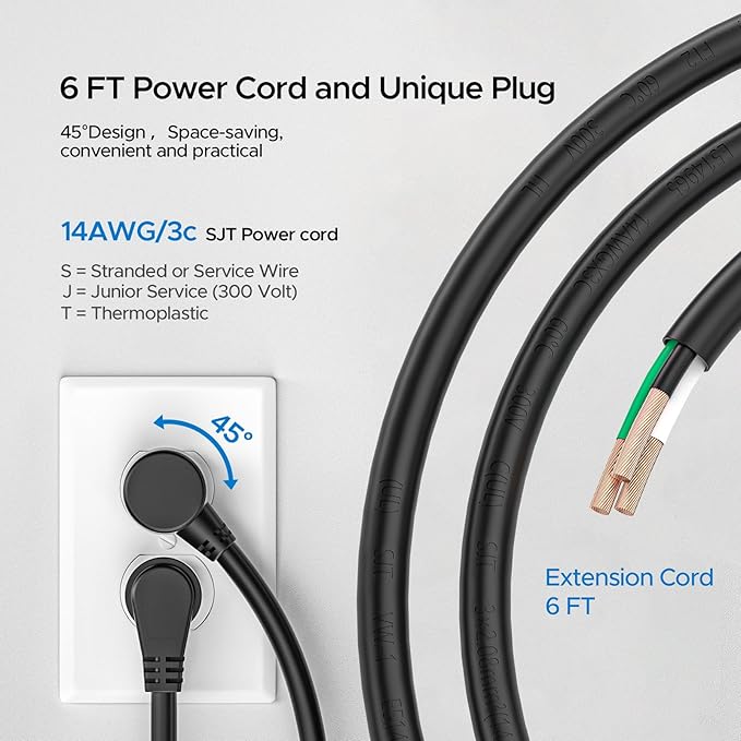 - [Metal Heavy Duty] 1.5mm extra-thick aluminum alloy housing and reinforced engineering plastic covers make it extremely strong and durable. 6 Feet Extension Cord UL is listed for better corrosion and oil resistance, and 15AMP/14AWG SJT grade wire supports up to 1875W of power.