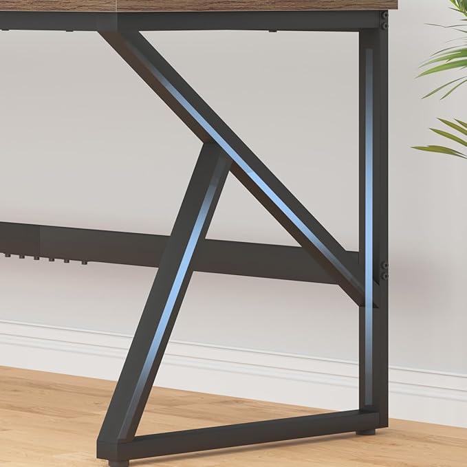 - 【Spacious Work Space & Leg Room】: Measuring 31.5"D x 70.8"W x 29.5"H overall, this large home office desk offers ample space to accommodate multiple monitors, pc, laptop, printers, files, books, lamps and any other office essentials, ensuring you have everything you need within arm's reach for enhanced productivity. The desktop is crafted from three meticulously joined panels, creating a cool cross-grain effect. Featuring two K-shaped metal legs with an open structure, this extra long computer desk provides ample leg room, promoting comfort during extended periods of use.