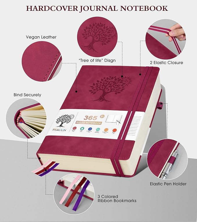 - 【365 Pages Premium Thick Paper】: Our PERCUN lined journal notebook is made of 365 pages high-quality 100Gsm thick ruled pager with an acid-free light Ivory paper that is thicker than normal. This premium quality paper will not cause bleeding, ghosting or smudging and is suitable for most types of pens,provides ample space for journaling, note-taking, and creative writing. The line spacing is 7mm, making it easy to write legibly and neatly.