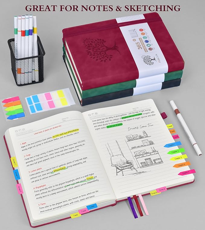 - 【180°Lay Flat for Writing】Our notebook also comes with 180°Lay Flat Journal Notebook, which makes writing a breeze. The elastic pen holder and bookmark ensure that you never lose track of your pen, and the 2 elastic closures ensure that your journal stays securely closed. The 3 colored ribbon bookmarks and 3 sticky labels provide even more ways to customize your journal to your liking.Built-in back pocket that is great for storing loose notes, cards, or other important items.