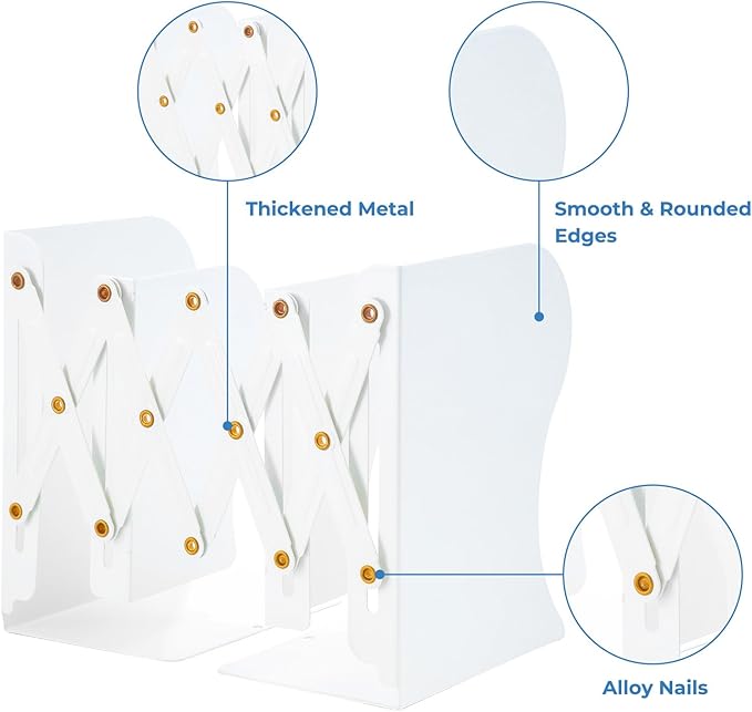 M&G Adjustable Bookends Book Ends for Shelves, Metal Bookend for Heavy Books, Desk Magazine File Organizer Holder Extends up to 20in, Book Stopper for Home, Office, Classroom (White)