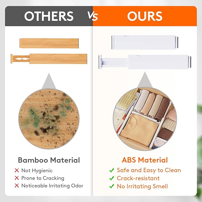 - Premium Material: Our adjustable drawer divider is made from high-quality ABS material, which is more sturdy for long-term use and crack-resistant than wooden material. Both ends are designed with premium EVA foam to prevent scratches and damage to the drawer walls