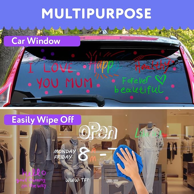 - Easy to Clean: When you’re ready to write & start fresh, a mere wipe of a wet paper towel will remove your erasable chalk markers completely and easily from almost any non-porous surface