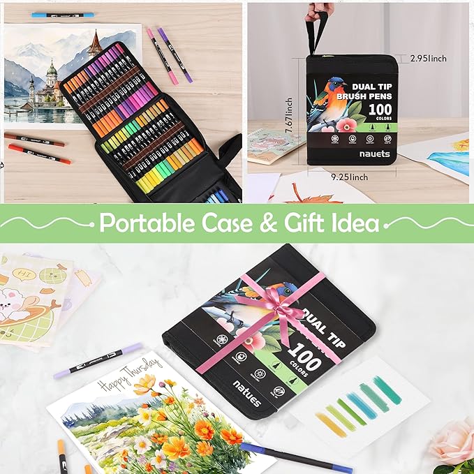 nauets 100 Colors Brush & Fine Dual Tip Watercolor Markers Set for Kids Adults Coloring Books No Bleeding Paint Pens For Drawing Note taking Planner Calligraphy Journaling Card Making Art Supplies
