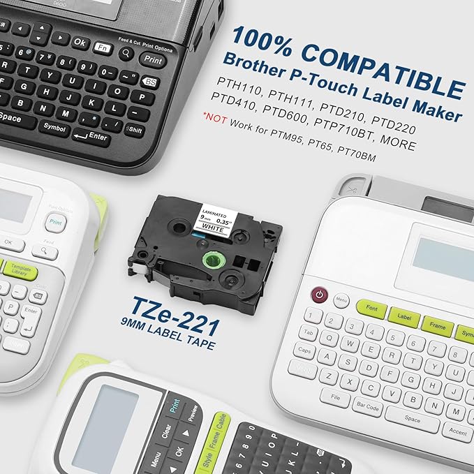 - Compatible with Brother p-touch label maker that using 9mm 0.35 white tze tape, such as PT-H110, PT-D210, PT-D220, PT-D200, PT-D202, PT-D410, PT-D400, PT-D400AD, PT-D410BT, PT-D600, PT-D610BT, PT-P710BT, PT-P700, PT-1890W, PT-P910BT, PT-H100, PT-H111, PT-D400VP, PT-D450, PT-D600VP, PT-P750W, PT-1280, PT-1290, PT-1880, PT-2030, PT-2730, PT-P300BT and more.