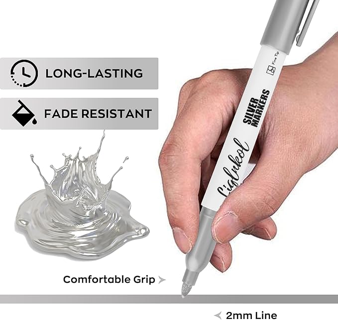 - Multi-use : Silver metallic markers are a great media to use for black paper, scrap booking, photo albums, DIY crafts, cards making, customized mugs, rock painting and holiday decorations. Easily mark light and dark surfaces with the bright, highly visible metallic finish of these silver metallic marker, adds sparkle embellishment to various craft works.