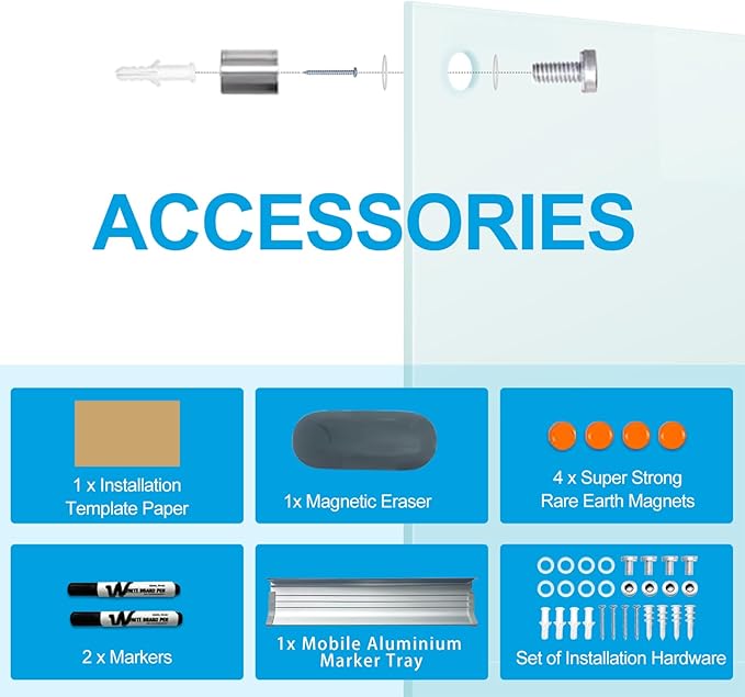 - COMPREHENSIVE ACCESSORIES SET: Comes with one 48" x 36" frameless tempered glass whiteboard, two markers, four magnets, one eraser and one marker tray for mounting. Pay special attention to the magnetism will not be strong due to the thickness of the glass, standard magnets do not work. Please use silvery super strong rare earth magnets. Don't use normal black magnet and fridge magnet