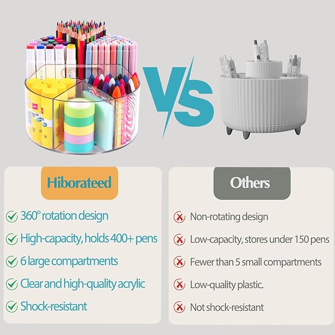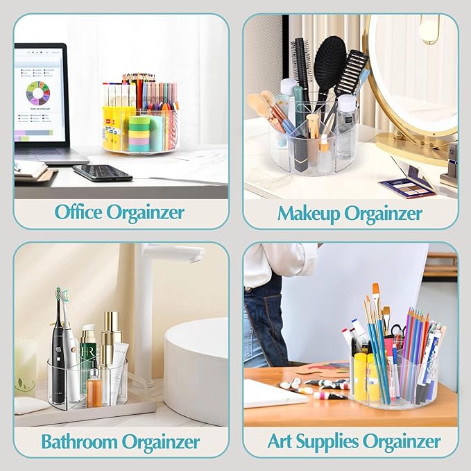 - 【360° Degree Spinning Design】Our acrylic pencil organizer is designed with a 360°rotatable base, allowing easy access to your pens and stationery items. The smooth spinning enables you to effortlessly turn to each compartment and organize your items by type, keeping everything organized and saving you time.