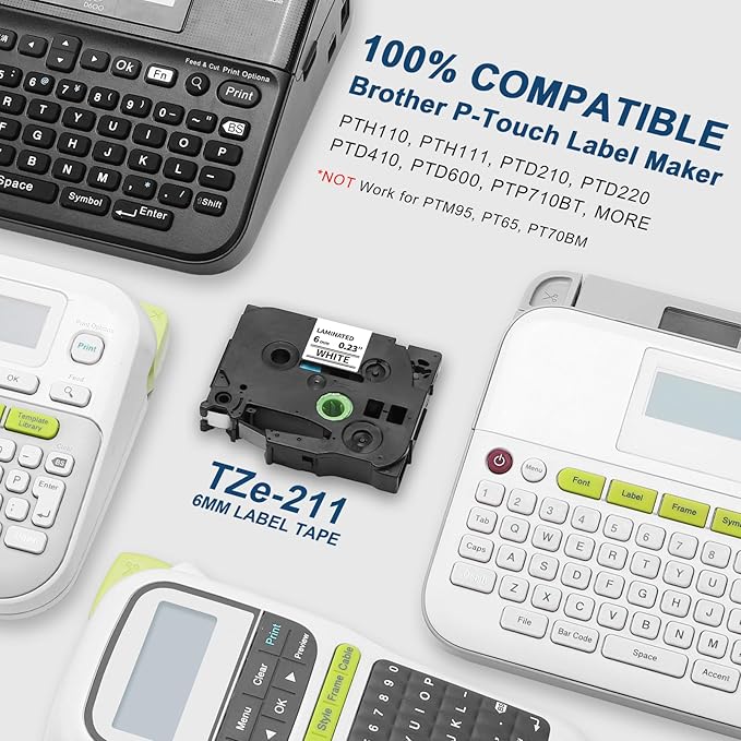 - Compatible with Brother ptouch label maker that using 6mm 0.23 white tze tape, such as PT-H110, PT-D210, PT-D220, PT-D200, PT-D202, PT-D410, PT-D400, PT-D400AD, PT-D410BT, PT-D600, PT-D610BT, PT-P710BT, PT-P700, PT-1890W, PT-P910BT, PT-H100, PT-H111, PT-D400VP, PT-D450, PT-D600VP, PT-P750W, PT-1280, PT-1290, PT-1880, PT-2030, PT-2730, PT-P300BT and more.