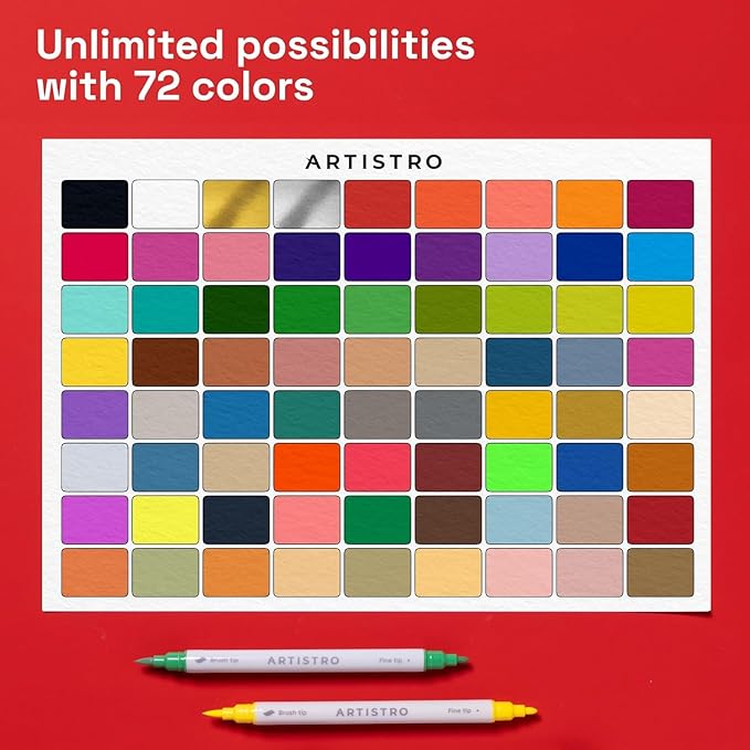 ARTISTRO 72 Dual Tip Fabric Markers - Acrylic Drawing Markers for All Ages & Levels - Fabric Paint Pens for Personalizing Clothes, T Shirts, Bags, Canvas, Textiles (Brush + Fine)