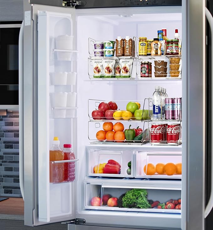 - Versatile Use: Great for storing fruits, veggies, packaged goods, yogurts, canned goods, drink boxes, baby food, condiments, cleaning supplies, bath products, makeup, and more. Versatile use as clear open front storage bins, stackable food storage bins, stackable kitchen storage, clear plastic bins for pantry, stackable cabinet storage bins, stackable bins for pantry, open bin storage basket, and stackable pantry bins