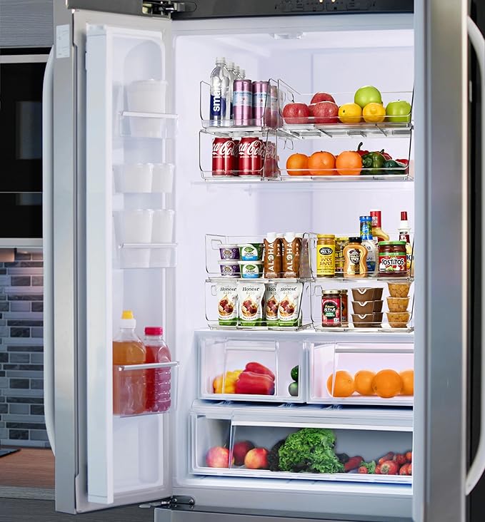 - Versatile Use: Great for storing fruits, veggies, packaged goods, yogurts, canned goods, drink boxes, baby food, condiments, cleaning supplies, bath products, makeup, and more. Versatile use as clear open front storage bins, stackable food storage bins, stackable kitchen storage, clear plastic bins for pantry, stackable cabinet storage bins, stackable bins for pantry, open bin storage basket, and stackable pantry bins
