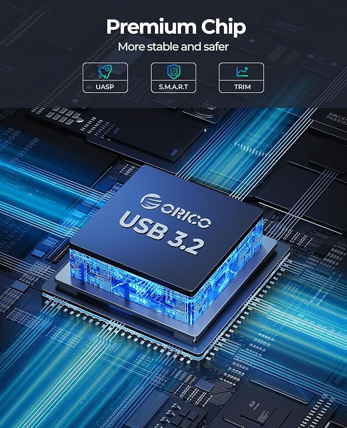 - 【6Gbps SuperSpeed Transmission】To maximize the SATA III 6Gbps transmission rate, the aluminum enclosure is equipped with a USB 3.2 Gen 2 chip that offers SuperSpeed 10Gbps and supports the UASP accelerated transmission protocol. This setup achieves speeds up to 70% faster than conventional USB 3.0, allowing you to transfer a 1GB file in just seconds