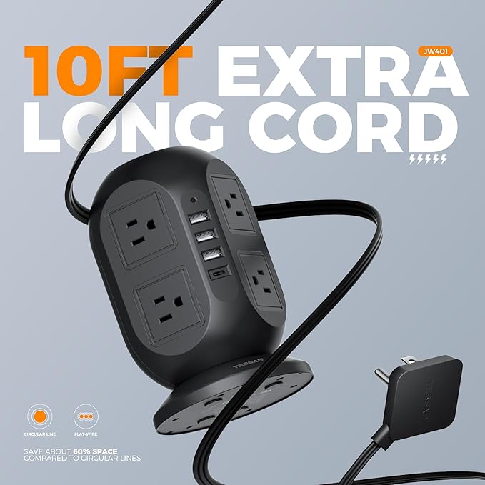 - Space Saving Design: 4-side compact design tower power strip takes up little space on your desk, cleans various cords and create a neat and tidy space; Stable base with 4 rubber feet at the bottom, efficiently keeps this 10 foot extension cord from slipping and sliding