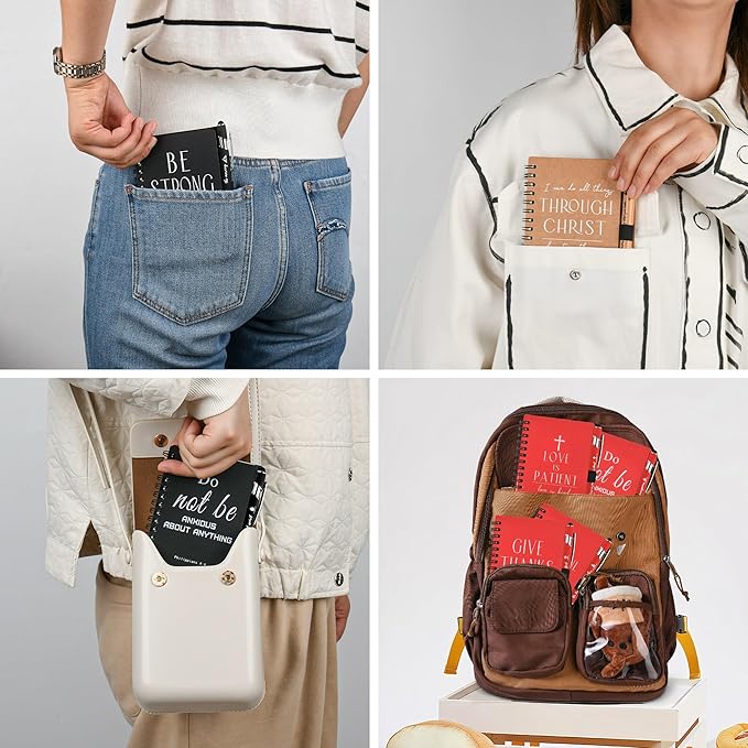 - Product Information: The compact and small notepad size is 4.13 x 5.43 inches / 10.5 x 13.8 centimeters, making it easy to fit into pockets, handbags, or car glove compartments. The pocket notebook features a sturdy cover, 50 inner pages, and Christian pens, making it convenient, practical, and not easy to lose.