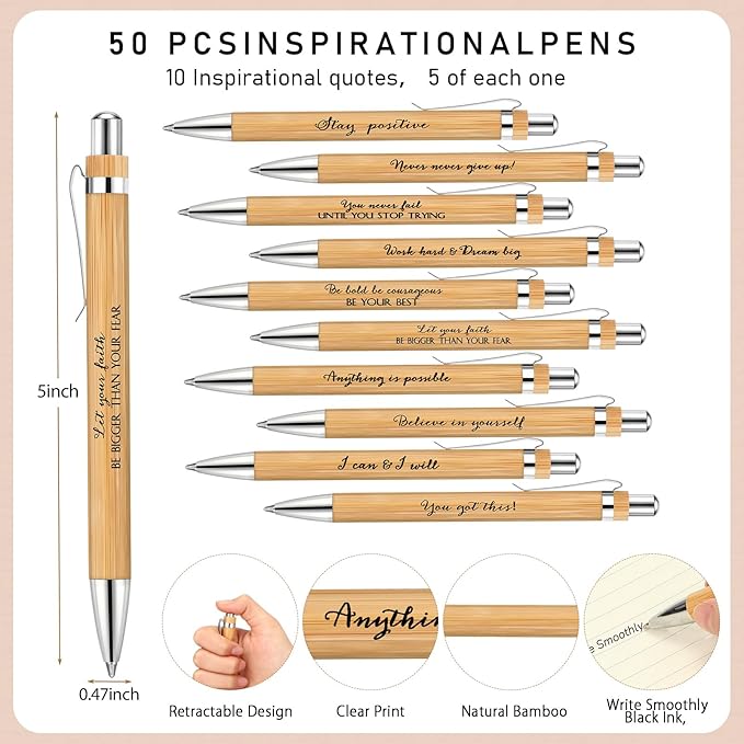 - Appreciation Gifts Bulk: you will receive 50 pcs of motivational spiral notebooks in 10 designs, 5 pcs for each design, each equipped with sticky notes and index tabs, and 50 pcs of retractable bamboo pens in 10 designs, 5 pcs for each design, enough quantity to satisfy your daily use and sharing needs