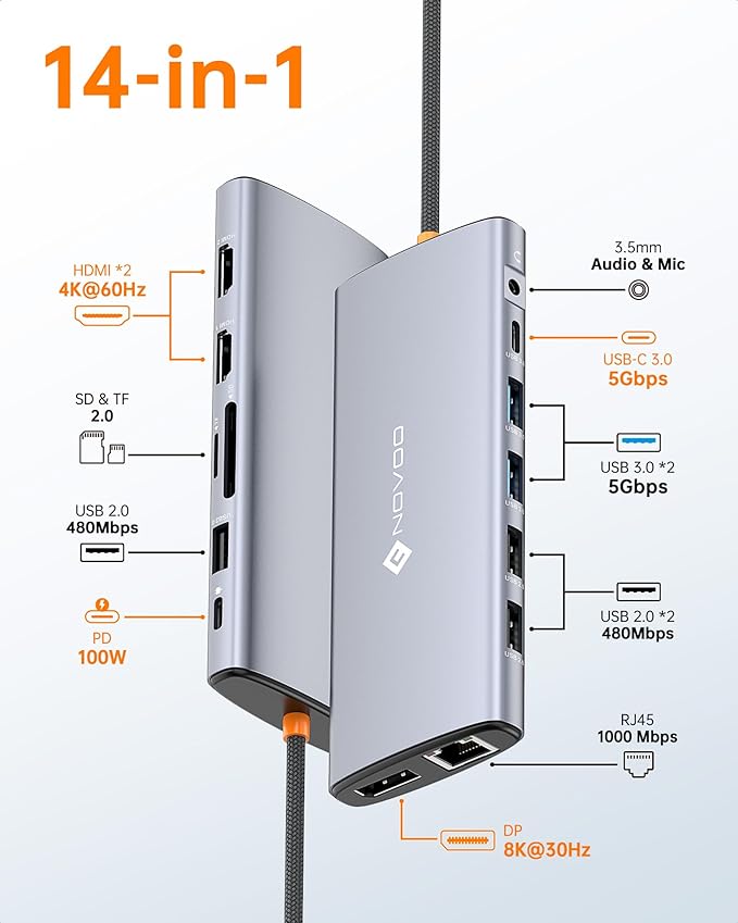 - 💞【14-in-1 USB C Docking Station】NOVOO USB C HDMI multiport hub equipped with 1*DP port, dual 4K HDMI ports, 2*USB A 3.0 ports, 1*Gigabit RJ45 port, 1*USB C PD100W charging port, 1*USB C data transfer port (speeds up to 5Gbps) and 3*USB 2.0 ports, SD/Micro SD card reader and 3.5mm microphone/audio port. Plug and play, no need to install any drivers or software.