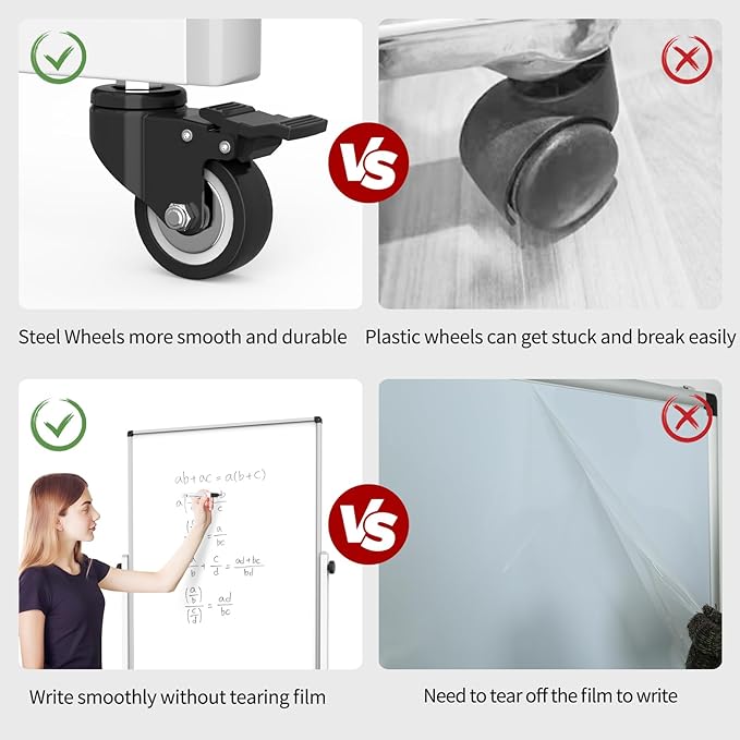 - Robust and Mobile: Our whiteboard features a sturdy aluminum frame and four steel casters, providing smooth 360° rotation and easy mobility. Lock the brakes for added stability during use.