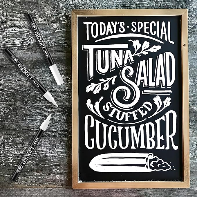- EFFORTLESS WRITING AND ERASING: Our white chalk pens feature a reversible dual tip design, allowing for flexible and diverse writing and drawing. Cleaning up is a breeze with liquid chalk markers erasable - simply wipe away residue with a damp cloth or eraser without leaving any marks, making your work more efficient and professional.