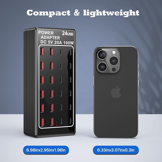 - âĄă24 Port Charging StationăUSB Charger Station Block with 12-USB-C ports and 12-USB-A portsïŒEach port max 2.4A), allowing multiple devices to charge simultaneously, with a total output of up to 100W. The USB C Charger Block provides the fastest charging speed and intelligently detects the power demand of each port of the connected device, ensuring safe and fast charging of the charger.