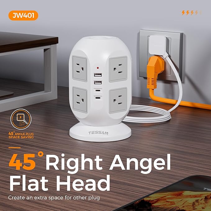 Tower Power Strip, Surge Protector 10 FT Cord, TESSAN Flat Plug Extension Cord with Multiple Outlets, 8 AC Outlets with 4 USB Ports (2 USB C), Charging Station with Surge Protection, for Office Dorm