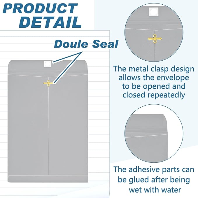 - Practical Sealing Mechanism: the metal clasps together with moisture activated gluing provide a secure grip and make the envelope easy to open and close repeatedly without damaging the content inside; The sealing mechanism ensures your documents stay safe and protected during handling
