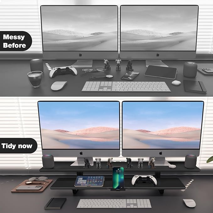 - 【2 Tier Desktop Organizer】After repeated design by the designer, the final selection of 37 inch width, in line with more than 95% of the desktop, with enough width and space. This monitor riser is big enough to support two monitors. You can easily store your office accessories & supplies under your monitor stand to keep your desktop tidy. This monitor stand rise comes with cable management slots that can keep the wires clean and orderly.