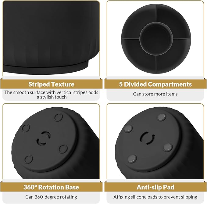 - Space-Saving: The design of 5 compartments can be reasonably divided into storage areas. This 4.8*3.2 inch desk organizer can be placed anywhere in the office, vanity, bathroom, bedroom, and living room