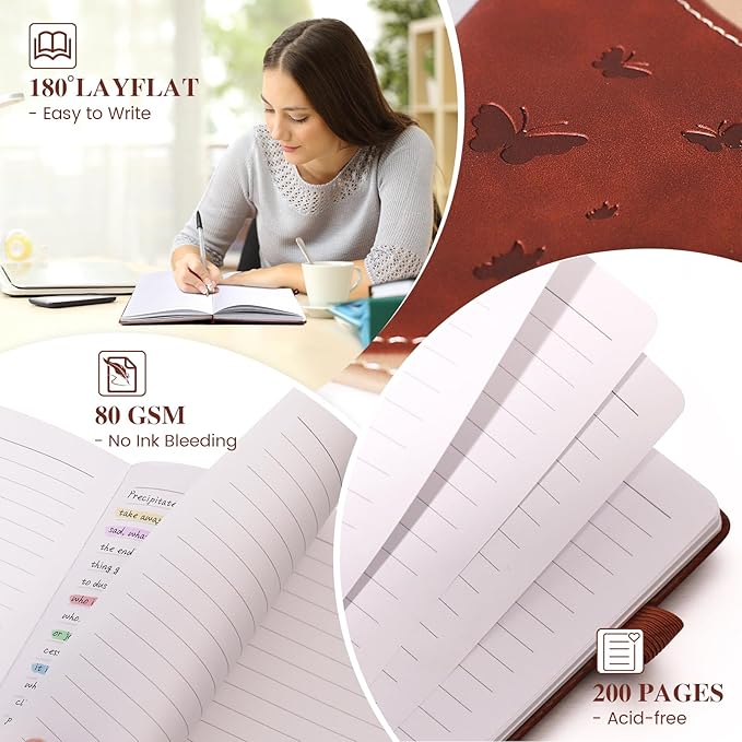 - 【180° Lay Flat Design】: Classic sturdy covers with Acid-free paper can be layed flat to 180 degree.After relaxing the binding a bit, it did lay perfectly flat, It is a comfortable writing experience.