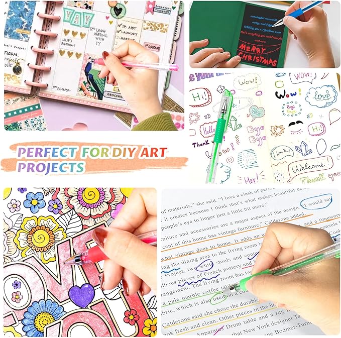 - With acid-free and non-toxic ink, our sparkly gel pens allow you to enjoy when Coloring Books, School Projects, Party Invites, Greeting Cards, Doodling, Letters to Friends