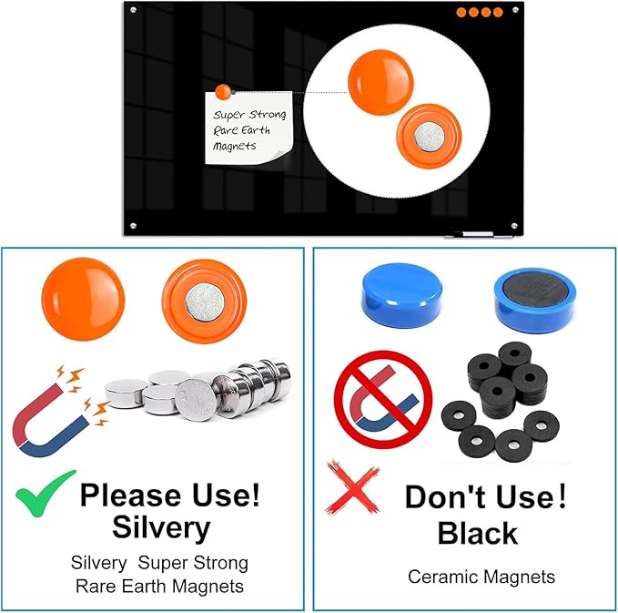- COMPREHENSIVE ACCESSORIES SET: Comes with one 48" x 36" frameless tempered glass whiteboard, two markers, four magnets, one eraser and one marker tray for mounting. Pay special attention to the magnetism will not be strong due to the thickness of the glass, standard magnets do not work. Please use silvery super strong rare earth magnets. Don't use normal black magnet and fridge magnet