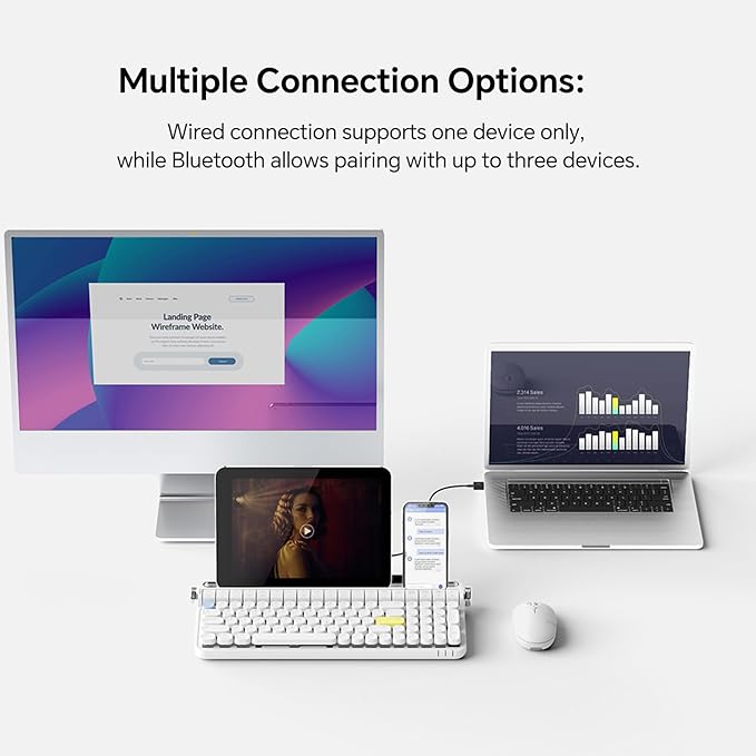 - 【100-Key Typewriter Keyboard with Knob Contro & numpad】 B705 Retro typewriter keyboard is compact, and still has 100 keys (including 12 convenient multimedia keys) and all the functions a typist needs to type efficiently.2 function knobs: Turn the left knob to change the connection channel. Turn the right knob to change the volume.B705 Retro Mechanical Keyboard is versatility and compact design make it ideal for desk accessories and workspace organizers.