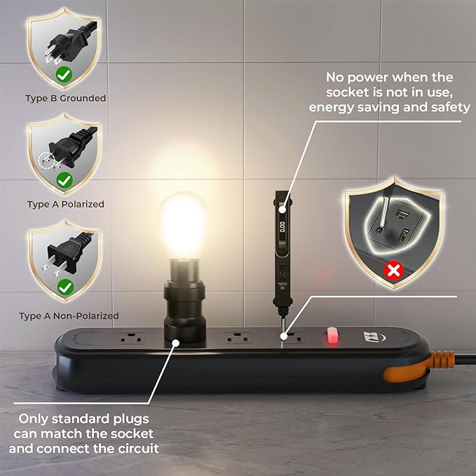 - Safety Structural Design:Our patented socket has been designed with safety as a top priority. It is compatible with standard American plugs and is equipped with a safety lock where the plug needs to be fully inserted to energise. This limits access to unintended items and helps prevent potential electrocution.