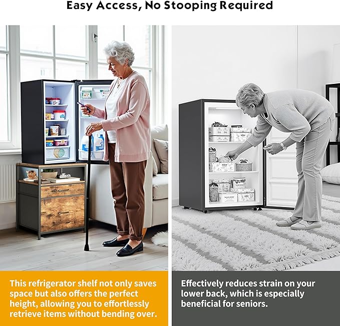- Grab Items with Ease - This mini fridge stand is designed to reduce strain on your back and lower back, making it especially suitable for seniors. By elevating your fridge, you'll no longer need to bend over frequently to access items, making everyday use more comfortable and convenient.