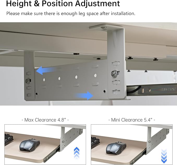 - 【Optimized Desk Space】: The keyboard attachment for desk is designed to optimize your desk space. When not in use, you can slide the keyboard platform under the desk easily. Create additional room on the desktop surface, allowing you to organize your workspace more efficiently. The desk extender tray comes with detailed installation instructions, and our local customer support team is always there to provide prompt assistance.