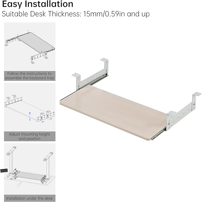 - 【Wide Compatibility】: This keyboard drawer is designed to be compatible with a wide range of desks, and is suitable for desktops made of materials such as wood, MDF, or other materials with similar characteristics (not compatible with plastic, stone, glass, etc.). The keyboard shelf can be easily mounted under the desk for flexibility in adding desktop space. Note: Make sure your desk is at least 43.31 x 15.75 x 28.74inches (L*W*H), and the desk is at least 0.59 inches thick. Please double check the size and whether there is enough leg room after installation before purchasing.